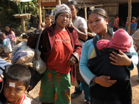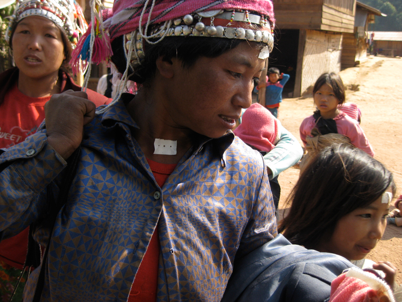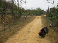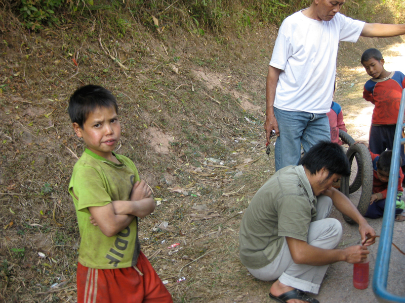 途中のアカ族の村で母子たちが一緒に乗せてけという。彼らを乗せて再度出発、したかと思ったら。