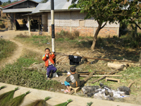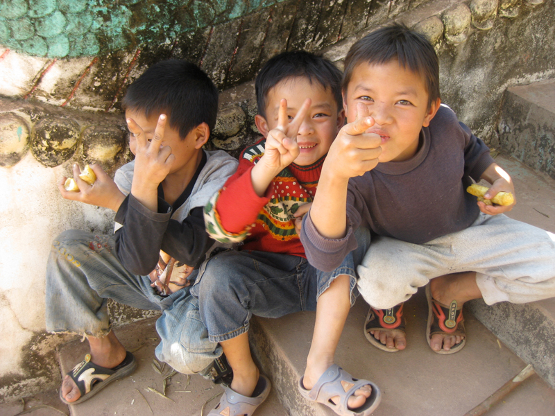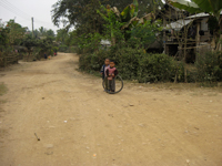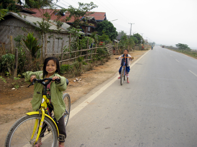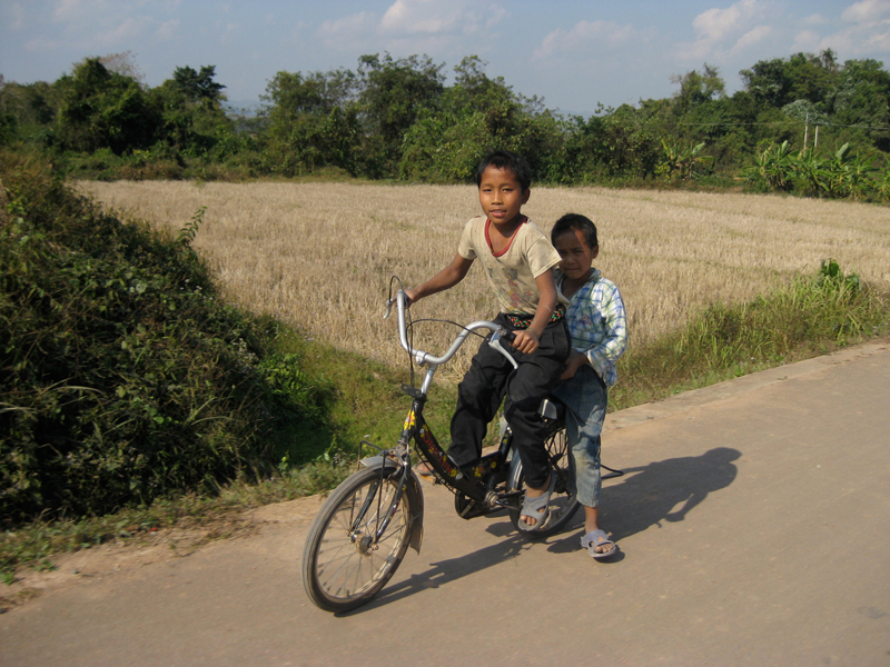 ムアンシンへと向かうアップダウンの多い舗装路をチャリで走っていると、村の子が楽しそうに並走してきます。