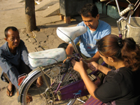 ちゃりのセッティングを終えたマイメカニック。家族ぐるみでやたら明るく親切なレンタルちゃり屋のファミリー。